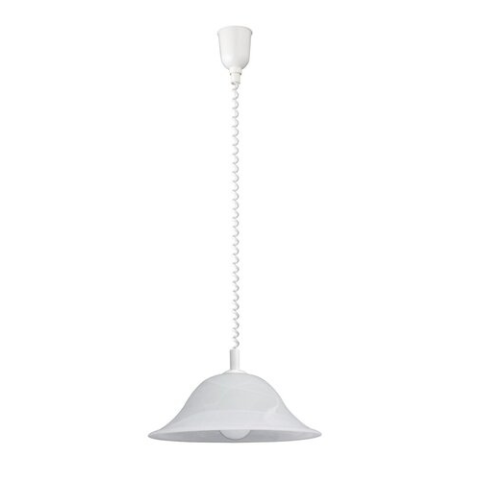 Időtlen stílusú függeszték króm színű fém és műanyag szerkezettel, 40 cm fehér burával és állítható fehér műanyag „rolly”val szerelt, 90 cm-es hosszúságú fix kivitelben. E27-es foglalatú, maximum 60W teljesítményű, halogén vagy LED fényforrással is haszná..