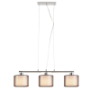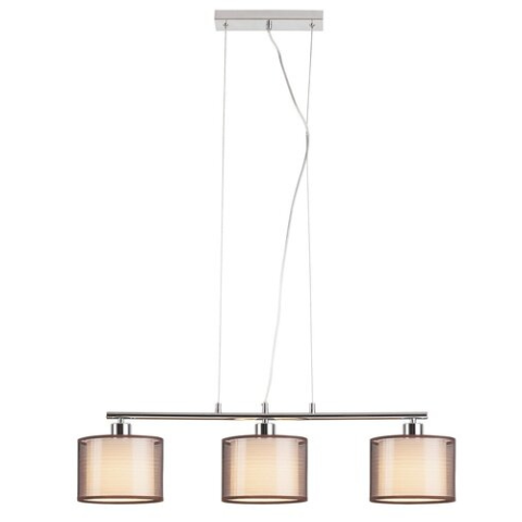 Időtlen megjelenésű függeszték 3 db foglalattal. 100 cm lelógású, 80 cm széles, króm színű fém lámpatest valamint barna és fehér színkombinációjú textil lámpabúra. A függeszték E-27-es foglalatú, max. 3x 60W teljesítményű energiatakarékos fényforrásokkal ..