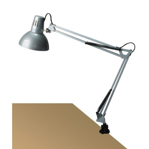 Nagyobb munkaterületen is megfelelő megvilágítást biztosító, időtlen megjelenésű asztali lámpa állítható karral és fejjel, 70 cm-es magassággal, ezüst színben. Fém alapanyag, tartós kivitel, IP20-as védettség. A lámpatest E27-es foglalatú, maximum 60W tel..