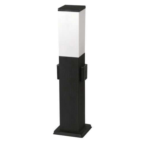 Időtlen megjelenésű kültéri talpas lámpa hálózati csatlakozó (dugaszoló) aljzattal, 1 db foglalattal. 50 cm magas, 12,5 cm széles, matt fekete színű fémből és fehér színű műanyagből készített lámpatest, UV sugárzásnak ellenálló, illetve IP44-es, azaz...