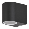 Modern megjelenésű kültéri fali lámpa 1 db foglalattal, lefelé világító kivitelben. 8 cm magas, 6,5 cm széles, fekete színű fémből készített lámpatest és üveg lámpabúra, IP44-es, fröccsenő víz és por elleni védelemmel. A lámpatest GU10-es foglalatú, max. ..
