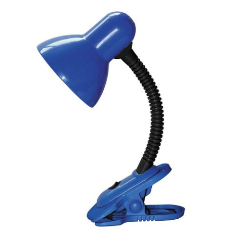 Asztali lámpa praktikus csíptethető rögzítési megoldással. Kék és fekete színű, fémből és műanyagból készített lámpatest, állítható pozíciójú fém búra, 34 cm-es magasság. A lámpatest max. 40W teljesítményű, E27-es foglalatú, halogén és energiatakarékos f..