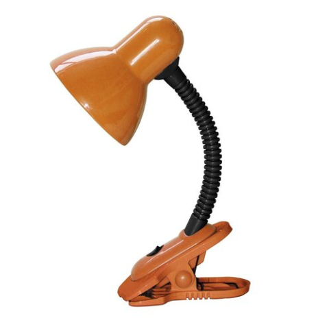 Asztali lámpa praktikus csíptethető rögzítési megoldással. Narancssárga és fekete színű, fémből és műanyagból készített lámpatest, állítható pozíciójú fém búra, 34 cm-es magasság. A lámpatest max. 40W teljesítményű, E27-es foglalatú, halogén és energiata..