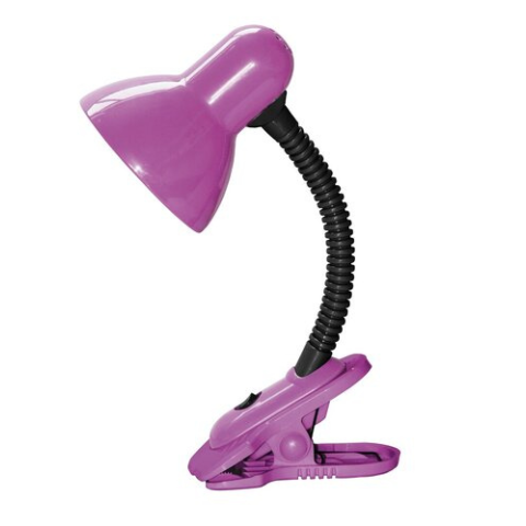 Asztali lámpa praktikus csíptethető rögzítési megoldással. Rózsaszín és fekete színű, fémből és műanyagból készített lámpatest, állítható pozíciójú fém búra, 34 cm-es magasság. A lámpatest max. 40W teljesítményű, E27-es foglalatú, halogén és energiatakar..
