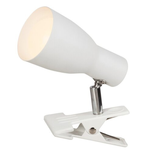 Időtlen megjelenésű spotlámpa praktikus, csíptethető rögzítéssi móddal, hálózati vezetékkel és kapcsolóval. 16 cm magas, fehér színű, fémből készített lámpatest és pozícionálható lámpabúra. A lámpatest E27-es foglalatkialakítású, max. 20W teljesítményű en..