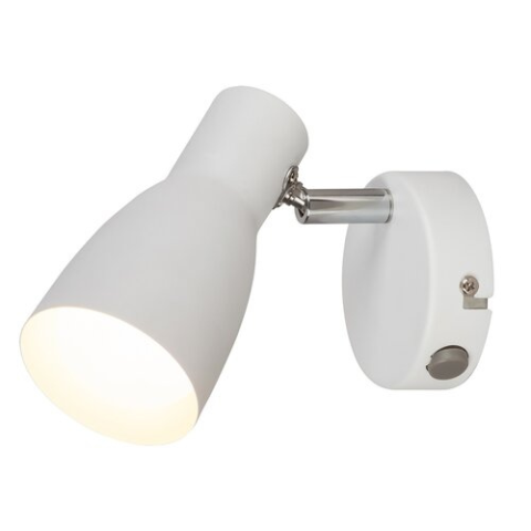 Időtlen megjelenésű oldalfali spotlámpa pozícionálható lámpabúrával és beépített kapcsolóval. 17 cm magas, fehér színű, fémből készített lámpatest és lámpabúra. A lámpatest E27-es foglalatkialakítású, max. 20W teljesítményű energiatakarékos kompakt vagy L..