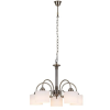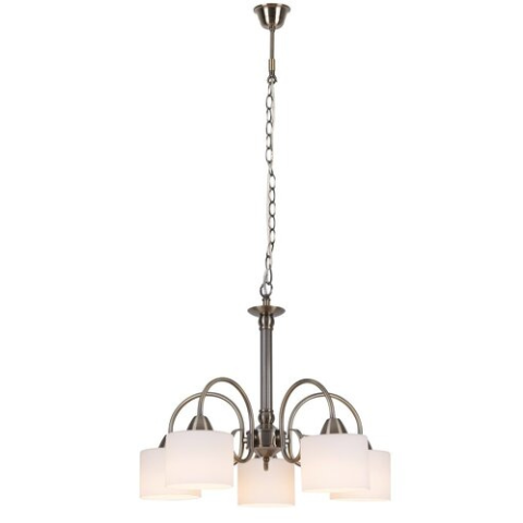 Klasszikus megjelenésű csillár 5 db foglalattal. 100 cm lelógású, 56 cm átmérőjű, antik bronz színű fémből készített lámpatest fehér színű üveg lámpabúrákkal, IP20-as védettséggel. A lámpatest E-27-es foglalatkialakítású, 5x max. 60W teljesítményű, energi..