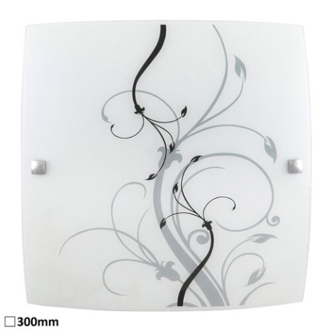 30 x 30 cm-es, romantikus megjelenésű mennyezeti lámpa. Fém szerkezet fehér domború opálüvegen fekete-fehér mintával. E27-es foglalatú, maximum 60W teljesítményű, halogén vagy LED fényforrással is használható...
