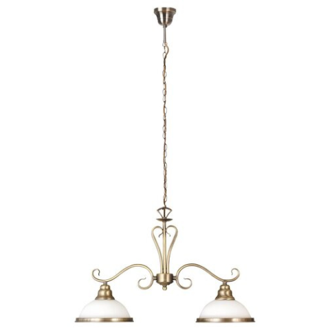 Klasszikus megjelenésű csillár 2 darab foglalattal. 62 cm átmérőjű, fix 116 cm lelógású, bronz színű fémből készített lámpatest és fehér színű üveg lámpabúrák. A lámpatest E27-es foglalatú, max. 2x 60W teljesítményű, halogén vagy energiatakarékos fényfor..