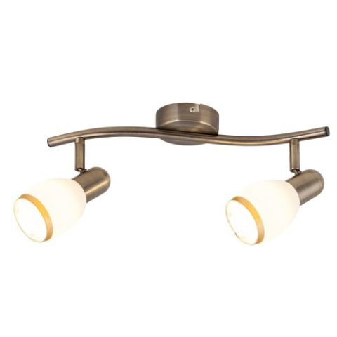 Modern megjelenésű mennyezeti spotlámpa 2 db foglalattal. 34 cm széles, bronz színű fém lámpatest és pozícionálható üveg lámpabúrák bronz és fehér színkombinációban. A lámpatest E-14-es foglalatú, max. 2x 40W teljesítményű energiatakarékos fényforrásokkal..
