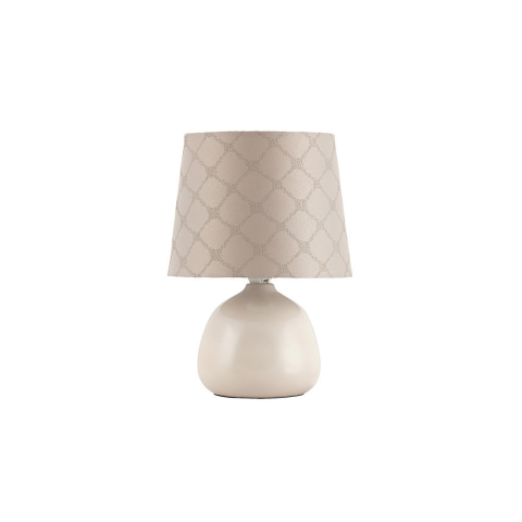 A Mintás asztali hangulatlámpa bézs színben, 26 cm-es magassággal, az Ellie Rábalux 4380 modellje, modern stílusú lakásvilágítási megoldás. A lámpatest kerámiából és textilből készült, átmérője 18 cm, magassága 26 cm. E14 foglalattal rendelkezik, melybe e