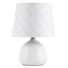 Időtlen megjelenésű éjjeli lámpa 1 db foglalattal, vezetékes kapcsolóval. 26 cm magas, 18 cm átmérőjű, fehér színű kerámia lámpatest és fehér alapszínű, halvány rácsmintás textil lámpaernyő. Az asztali lámpa E14-es foglalatú, max. 40W teljesítményű energi..