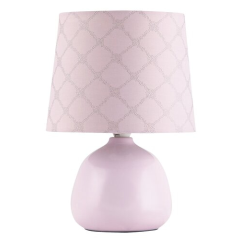 Időtlen megjelenésű éjjeli lámpa 1 db foglalattal, vezetékes kapcsolóval. 26 cm magas, 18 cm átmérőjű, rózsaszín kerámia lámpatest és rózsaszín, halvány rácsmintás textil lámpaernyő. Az asztali lámpa E14-es foglalatú, max. 40W teljesítményű energiatakarék..