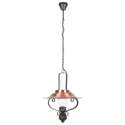 Klasszikus stílusú, rusztikus megjelenésű csillár 1 darab foglalattal. 110 cm-es fix lelógású, 38 cm átmérőjű, fekete színű fémből készített, dió színű faberakással díszített lámpatest, bronz színű fém és üveg kombinációjú búrával. A lámpatest E27-es fogl..