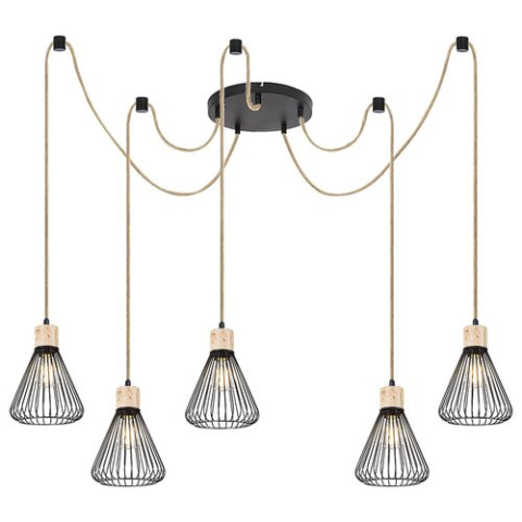 Az indusztriális stílusú Farfalle ötös függeszték modern nappalink vagy hálószobánk berendezésének jellegzetes darabja lehet. A fémből és fából készült modellt a lefelé szélesedő, harang alakú rácsos búrák és a lámpafejek színéhez igazodó kötélkábelek tes..