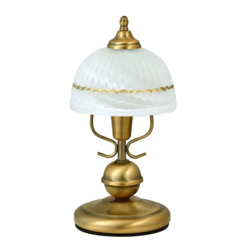 Klasszikus megjelenésű éjjeli lámpa 1 db foglalattal. 32 cm magas, bronz színű fémből készített lámpatest 16 cm átmérőjű, diszkrét bronz mintás, fehér opálüveg búrával. A lámpatest E14-es foglalatú, max. 40W teljesítményű halogén vagy energiatakarékos f..