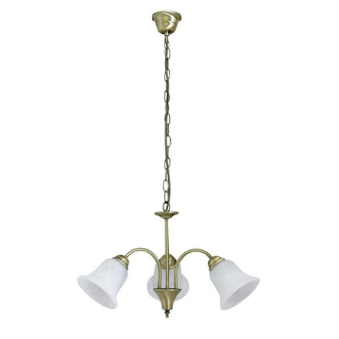 Klasszikus megjelenésű csillár 3 darab foglalattal. 90 cm lelógású, 60 cm átmérőjű, bronz színű fémből készített lámpatest fehér alabástrom üvegbúrákkal. A csillár E14-es foglalatú, max. 3x 40W teljesítményű halogén vagy energiatakarékos fényforrásokkal ..