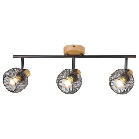 A Grendel Rábalux 3129 spot lámpa vintage stílusú mennyezeti világítótest, amely fekete színű necc búrával és fa elemekkel rendelkezik. A lámpatest három darab E14 foglalattal szerelt, amelyekbe cserélhető fényforrás helyezhető, így a fényáram, a fényszín