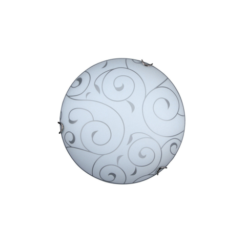 A Harmonylux Rábalux 3852 mennyezeti lámpa 30 cm átmérővel, króm és fehér színben, inda mintával díszített üveg burával rendelkezik. A lámpatest egy darab E27 foglalattal szerelt, amelybe cserélhető fényforrás helyezhető el. A termék fém és üveg anyagok f