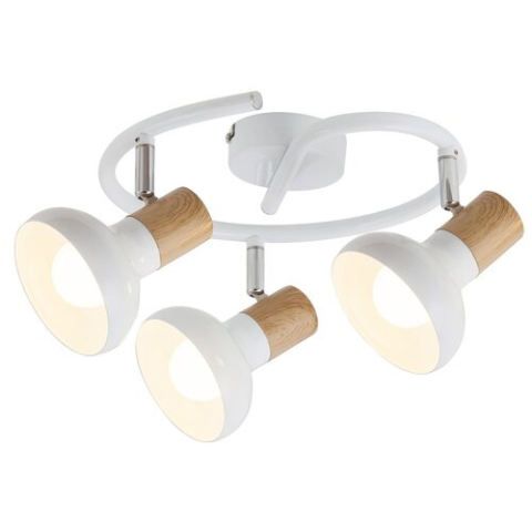 Skandináv stílusú mennyezeti spotlámpa 3 db foglalattal. 40 cm átmérőjű, fehér és bükk színkombinációjú fém lámpatest pozícionálható lámpabúrákkal, IP20-as védettséggel. A lámpatest E-14-es foglalatkialakítású, 3x max. 40W teljesítményű, energiatakarékos ..