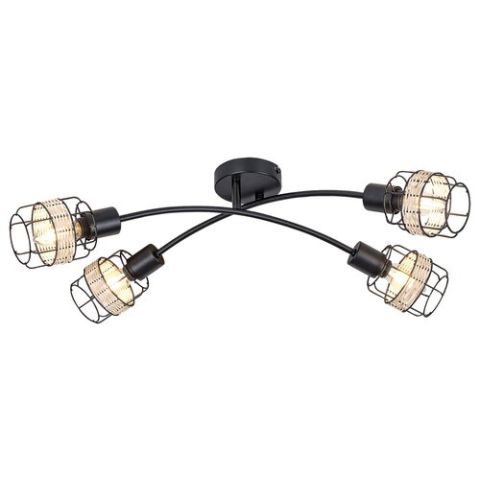Az indusztriális stílusú Indiana négyes spotlámpa modern nappalink, hálószobánk, étkezőnk vagy konyhánk berendezésének stílusos darabja lehet. A fémből készült, matt fekete modellt rácsos búrák, valamint a búrákon körbefutó természetes, fonott dekoráció t..