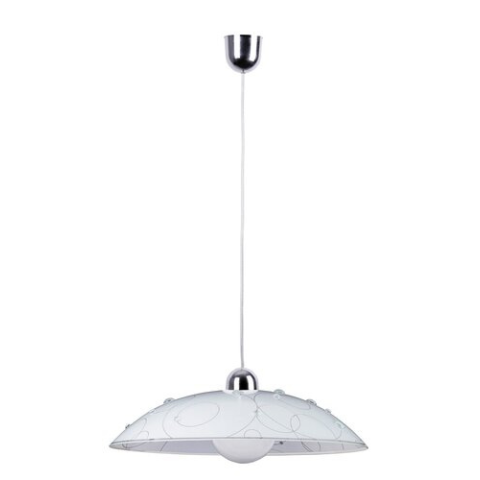 Időtlen megjelenésű függeszték, 40 cm átmérőjű, 3D hatású mintás, üveggyöngyözött üvegbúrával. Fix vezetékezés, 90 cm-es hosszúságú, fehér és króm színű. Használható valamennyi E27-es, maximum 60W teljesítményű, halogén vagy LED fényforrással. Kialakítás..