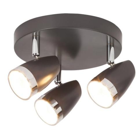 Modern megjelenésű mennyezeti spotlámpa, 3 db beépített energiatakarékos LED fényforrással. 19 cm átmérőjű, antracit szürke és króm színű, fémből és műanyagból készített lámpatest pozícionálható lámpabúrákkal. A beépített LED-es lámpa teljesítménye 3x4 W,..