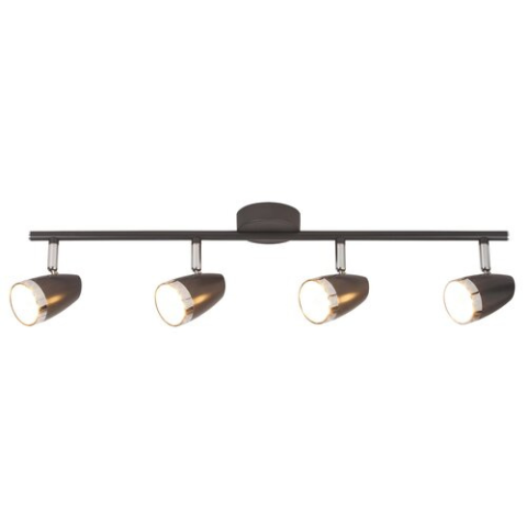 Modern megjelenésű mennyezeti spotlámpa, 4 db beépített energiatakarékos LED fényforrással. 60,5 cm széles, antracit szürke és króm színű, fémből és műanyagból készített lámpatest pozícionálható lámpabúrákkal. A beépített LED-es lámpa teljesítménye 4x4 W,..