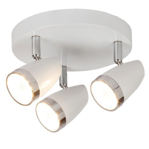 Modern megjelenésű mennyezeti spotlámpa, 3 db beépített, energiatakarékos LED fényforrással. 19 cm átmérőjű, fehér és króm színű, fémből és műanyagból készített lámpatest pozícionálható lámpabúrákkal. A beépített LED-es lámpa teljesítménye 3x4 W, melyhez ..