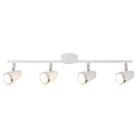 Modern megjelenésű mennyezeti spotlámpa, 4 db beépített energiatakarékos LED fényforrással. 60,5 cm széles, fehér és króm színű, fémből és műanyagból készített lámpatest pozícionálható lámpabúrákkal. A beépített LED-es lámpa teljesítménye 4x4 W, melyhez 4..
