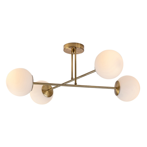 Az üde és elegáns megjelenésű, modern stílusú Kiara négyes mennyezeti lámpa remek választás a nappaliba vagy a hálószobába. A fémből készült, aranyszínű lámpatestet fehér üvegbúrák egészítik ki, és a lámpa kisméretű, kerek dísztalp segítségével rögzíthető..