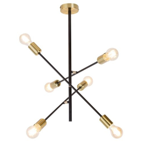Indusztriális stílusú függeszték 6 db foglalattal. 65 cm lelógású, 56 cm átmérőjű, fekete és arany színű, fémből készített szerkezet IP20-as védettséggel. A lámpatest E27-es foglalatkialakítású, 6x max. 15W teljesítményű, kizárólag energiatakarékos izzókk..