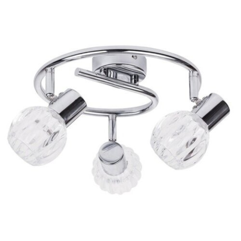 Modern megjelenésű mennyezeti spotlámpa 3 db foglalattal. 25 cm átmérőjű, króm színű fém lámpatest és pozícionálható, üveg lámpabúrák, IP20-as védelemmel. A lámpatest E-14-es foglalatú, max. 3x 40W teljesítményű energiatakarékos fényforrásokkal is használ..