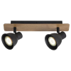 Indusztriális stílusú fali spotlámpa 2 db foglalattal. 32 cm széles, fekete színű és fa hatású, bükk színű fémből készített szerkezet. Pozícionálható lámpabúrákkal, 2 db kapcsolóval és IP20-as védettséggel. A lámpatest GU10-es foglalatkialakítású, 2x max..