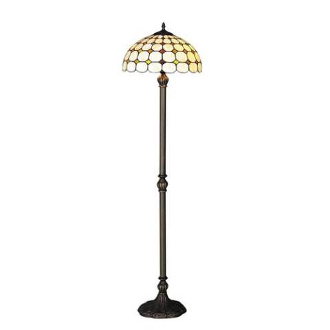 Klasszikus megjelenésű, Tiffany lámpabúrás állólámpa 2 db foglalattal. 148 cm magas, 40 cm átmérőjű, bronz színű fémből készített lámpatest színes Tiffany-stílusú üveg lámpabúrával, IP20-as védelemmel. A lámpatest E-27-es foglalatú, max. 2x 60W teljesítmé..