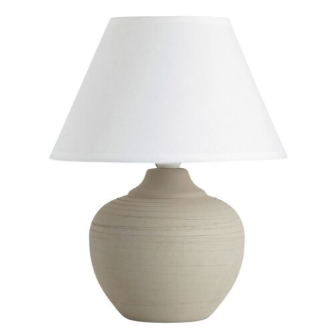 Időtlen megjelenésű éjjeli lámpa 1 db foglalattal. 20,5 cm átmérőjű, 25 cm magas, bézs színű kerámia lámpatest és fehér színű textil lámpabúra. A lámpatest E14-es foglalatú, max. 40W teljesítményű energiatakarékos fényforrással is használható...
