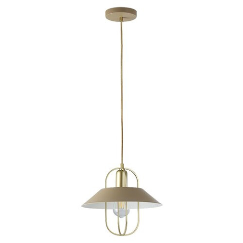 Az indusztriális stílusú Nesrin függeszték modern nappalink, étkezőnk vagy hálószobánk berendezésének jellegzetes darabja lehet. A teljes egészében fémből készült, aranyszínű modellt kalapszerű, bézs búra teszi teljessé és kerek dísztalp segítségével rögz..