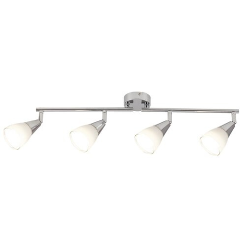 Modern megjelenésű mennyezeti spotlámpa 4 db foglalattal. 59,5 cm széles, króm színű fém lámpatest és pozícionálható, fehér színű üveg lámpabúrák, IP20-as védelemmel. A lámpatest E-14-es foglalatú, max. 4x 40W teljesítményű energiatakarékos fényforrásokka..