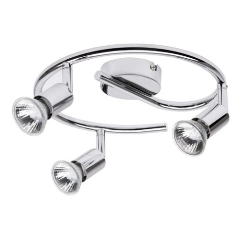 Modern megjelenésű mennyezeti spotlámpa 3 db foglalattal. 25 cm átmérőjű, króm színű, fémből készített lámpatest és pozícionálható lámpabúrák. A lámpatest GU10-es foglalatkialakítású, max. 3x 50W teljesítményű energiatakarékos fényforrásokkal is használha..