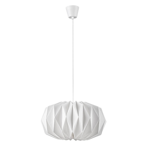 Az Ormini Rábalux 72003 függesztett lámpa modern, matt fehér origami hatású kialakítással készült, amely egyedi vizuális élményt nyújt bármely belső térben. A lámpatest átmérője 430 mm, magassága 1400 mm, így kiválóan alkalmazható magasabb belmagasságú he