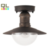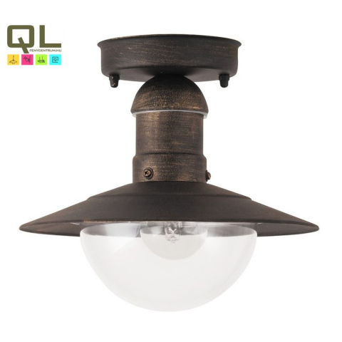Rusztikus megjelenésű kültéri mennyezeti lámpa 1 db foglalattal, UV sugárzásnak ellenálló kivitelben, IP44-es, azaz fröccsenő víz elleni védettséggel. 21.5 cm magas, 24 cm átmérőjű, antik arany színű, fémből készített lámpatest áttetsző műanyag búrával. A lámpatest E27-es foglalatkialakítású, max. 60W teljesítményű fényforrással használható.