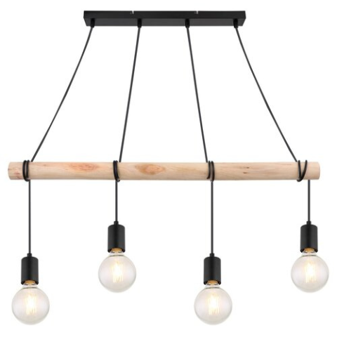 Az indusztriális stílusú Pablo négyes függeszték a nappali, a konyha, az étkező vagy a hálószoba berendezésének jellegzetes darabja lehet. A fémből és fából készült modell matt fekete lámpatestből, fa tartórúdból és szabadon álló fényforrásokból áll, és h..