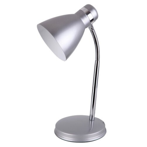 Praktikus íróasztali megvilágítást biztosító asztali lámpa. 32 cm magas, fémből készített, ezüst és króm színű lámpatest, ezüst színű, pozícionálható lámpabúrával, hálózati vezetékkel és kapcsolóval. A lámpatest max. 40W teljesítményű, E14-es foglalatú, ..