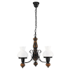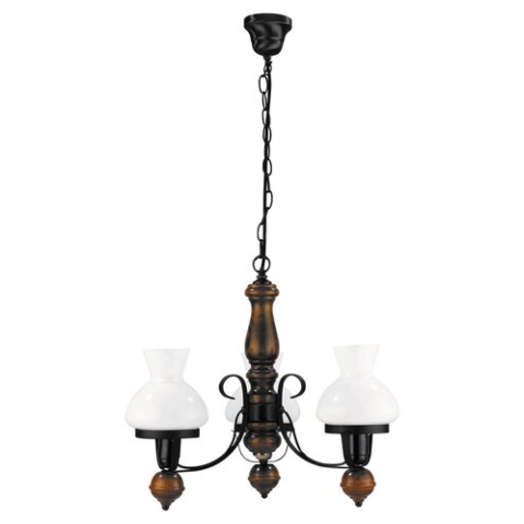 Rusztikus megjelenésű csillár 3 darab foglalattal. 100 cm maximum lelógású, 60 cm átmérőjű, matt fekete színű fémből és dió színű fabetétekkel készített lámpatest, fehér színű opálüveg lámpabúrákkal. A lámpatest E27-es foglalatú, max. 3x 60W teljesítményű..