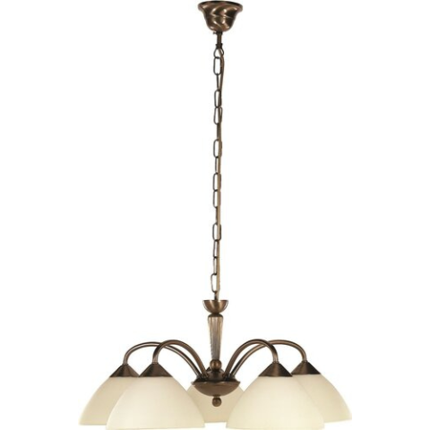 Klasszikus megjelenésű függeszték 5 db foglalattal. 90 cm lelógású, 52 cm átmérőjű, bronz színű fémből készített lámpatest krém színű üveg lámpabúrákkal. A lámpatest E-14-es foglalatú, max. 5x 40W teljesítményű energiatakarékos fényforrásokkal is használh..