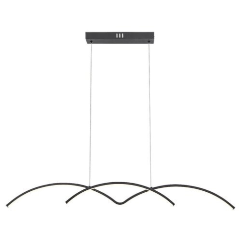 A River Rábalux 6899 íves, tripla függesztett LED lámpa modern, minimál stílusú világítási megoldás, amelyet elsősorban lakóterekhez terveztek. A lámpatest fő anyaga fém és műanyag, színe fekete és fehér kombinációban jelenik meg. A beépített LED modul 40