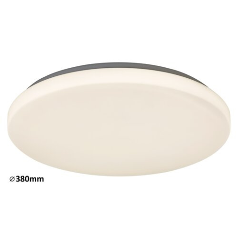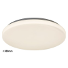 Modern megjelenésű mennyezeti lámpa beépített energiatakarékos LED izzóval. 38 cm átmérőjű, fémből és műanyagból készített lámpatest fehér színben, IP20-as védettséggel. A lámpatestbe beépített LED izzó 32W teljesítmény mellett 2600 lumen fényerőt, valami..