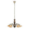 Rusztikus megjelenésű csillár 5 db foglalattal. 100 cm lelógású, 70 cm átmérőjű, bronz színű fémből és dió színű fából készített lámpatest barna mintás opálüveg lámpabúrákkal, IP20-as védelemmel. A lámpatest E14-es foglalatú, max. 5x 40W teljesítményű, ak..