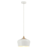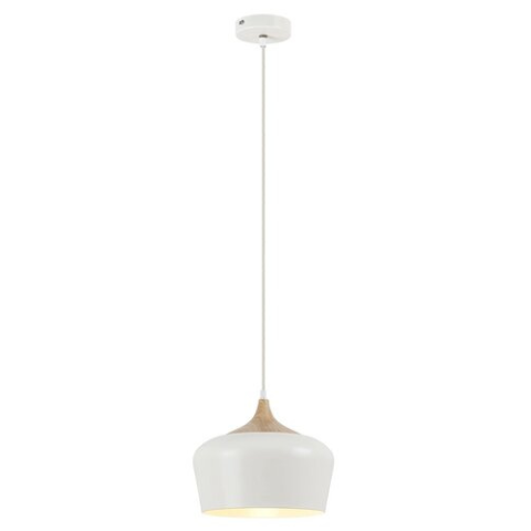 Skandináv stílusú függeszték 1 db foglalattal. 130 cm lelógású, fehér színű fém szerkezet továbbá fehér és bükk színkombinációjú, 30 cm átmérőjű fém lámpabúra. A függeszték E-27-es foglalatú, max. 60W teljesítményű energiatakarékos fényforrással is haszná..