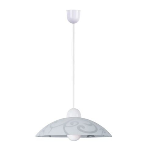 Időtlen megjelenésű függeszték, 30 cm átmérőjű, mintás üvegbúrával. Fix vezetékezés, 90 cm-es hosszúságú, fehér és áttetsző színű. Használható valamennyi E27-es, maximum 60W teljesítményű, halogén vagy LED fényforrással...